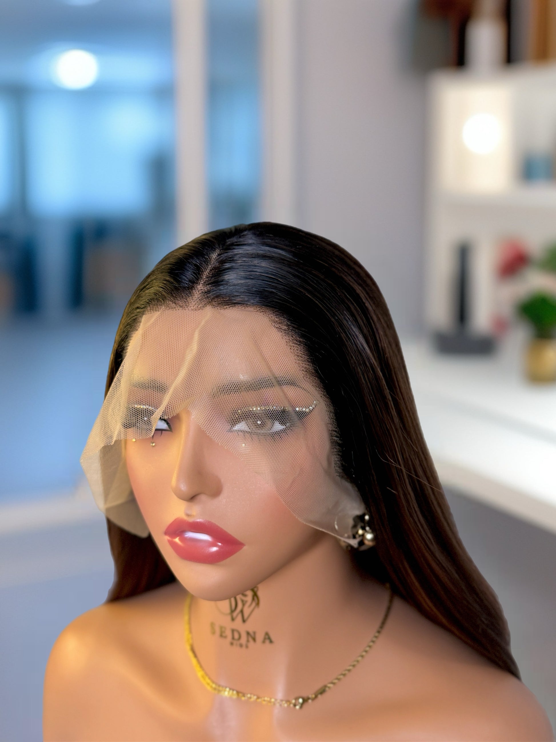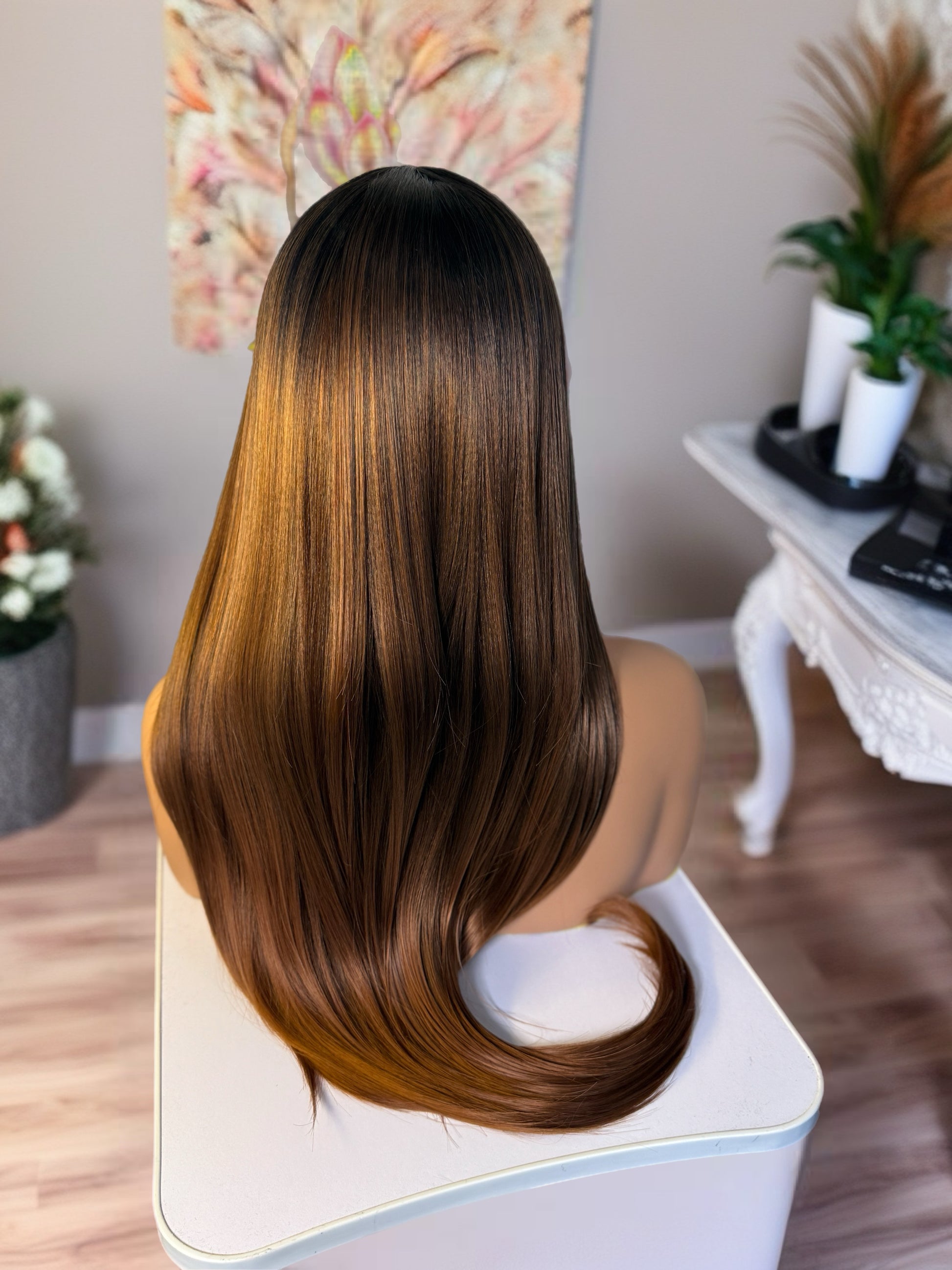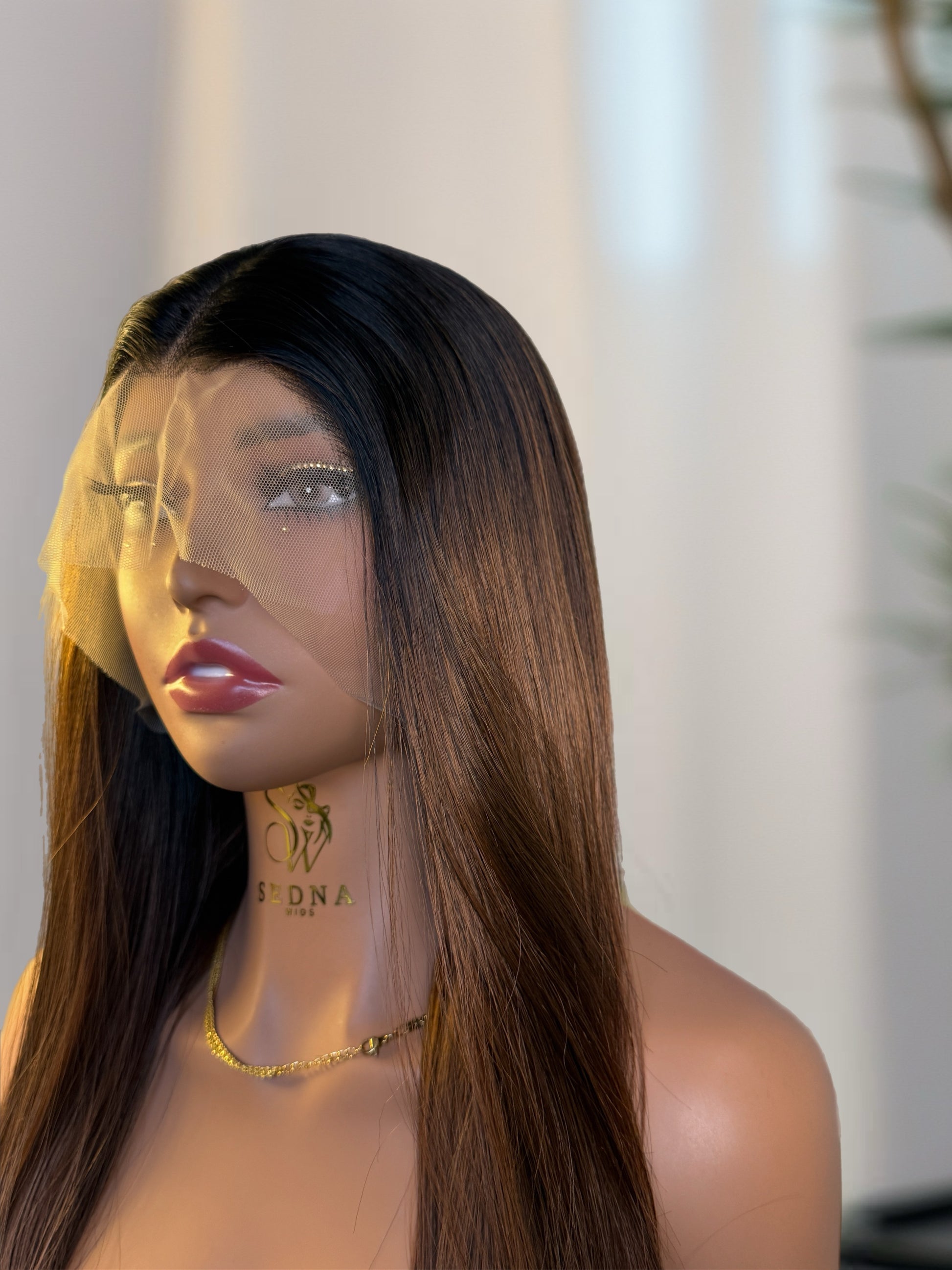 Experience the perfect balance of warmth and depth with our Empress Ombré—a refined 24-inch creation featuring a seamless transition from deep roots to rich caramel ends. The lightweight 150g density provides natural fullness while the 13x4 lace front creates a flawless hairline.